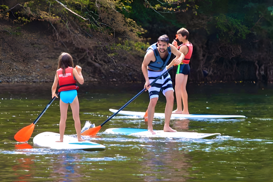 Envie d’une alternative au canoë ? Le stand up paddle (SUP) se pratique directement sur la rivière, pour une sortie plus fun et plus sportive… ou au contraire très tranquille si vous cherchez juste à vous laisser porter. La location démarre à partir de 20 € par personne (selon formule) avec une condition simple : savoir nager. Parfait pour une sortie courte, une initiation, ou une balade au fil de l’eau quand il fait chaud.