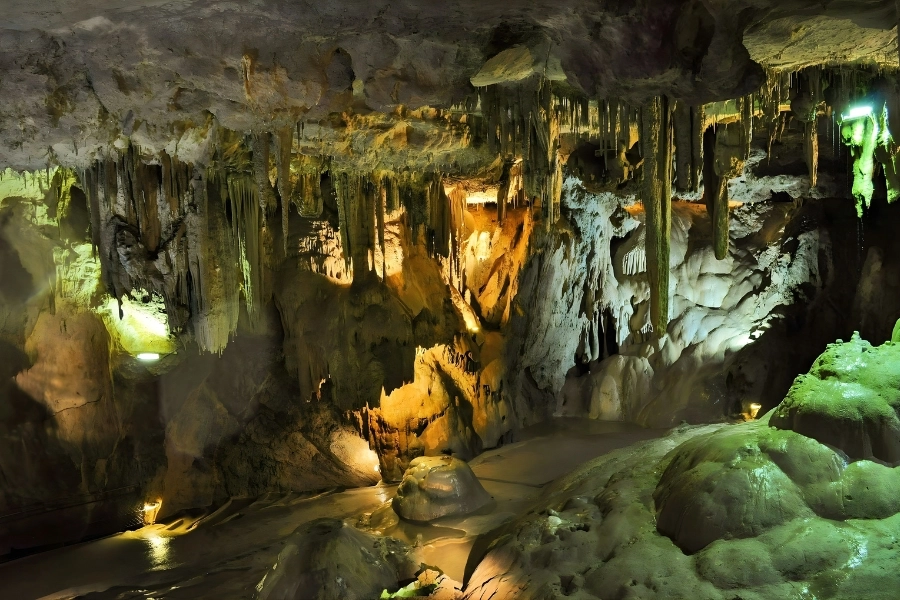 • La première grotte dévoile un décor féérique : stalactites élancées, stalagmites massives, piliers majestueux, et une forêt minérale sculptée par l’érosion,