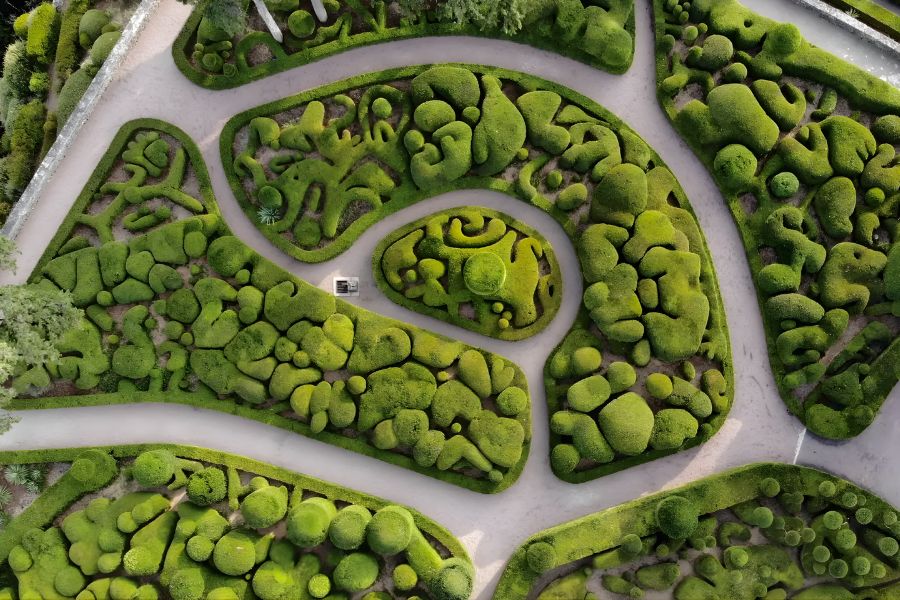 Marqueyssac, c’est d’abord une signature : 150 000 buis centenaires taillés à la main, alignés, arrondis, sculptés, formant des “chambres de verdure” où l’on flâne à l’ombre. Le parc fait 22 hectares et propose plus de 6 km d’allées, entre belvédères, rocailles, cascades, théâtres de verdure… Chaque détour ouvre une nouvelle perspective sur la vallée de la Dordogne.