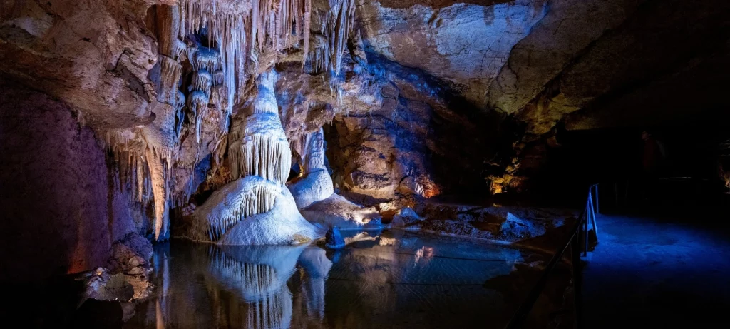 Les Grottes de Lacave se visitent en petit train : stalactites, salles féeriques, concrétions géantes, parcours guidé, fraîcheur garantie toute l’année.