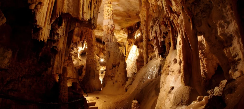 Les Grottes de Presque impressionnent avec de hautes concrétions, draperies et “cierges” géants, cascade pétrifiée, visite guidée d’environ 45 minutes.