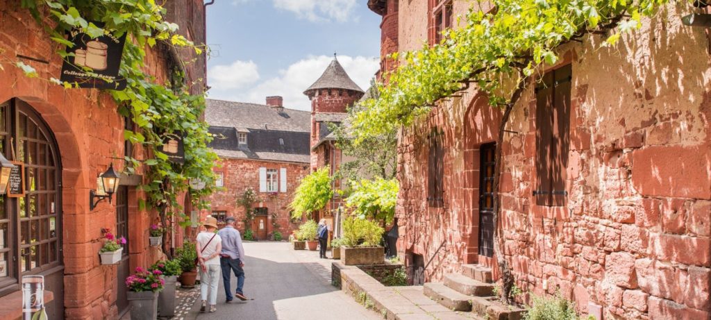 Collonges-la-Rouge, village de grès rouge, charme avec ruelles médiévales, tours, boutiques, patrimoine unique, ambiance vivante en Corrèze.